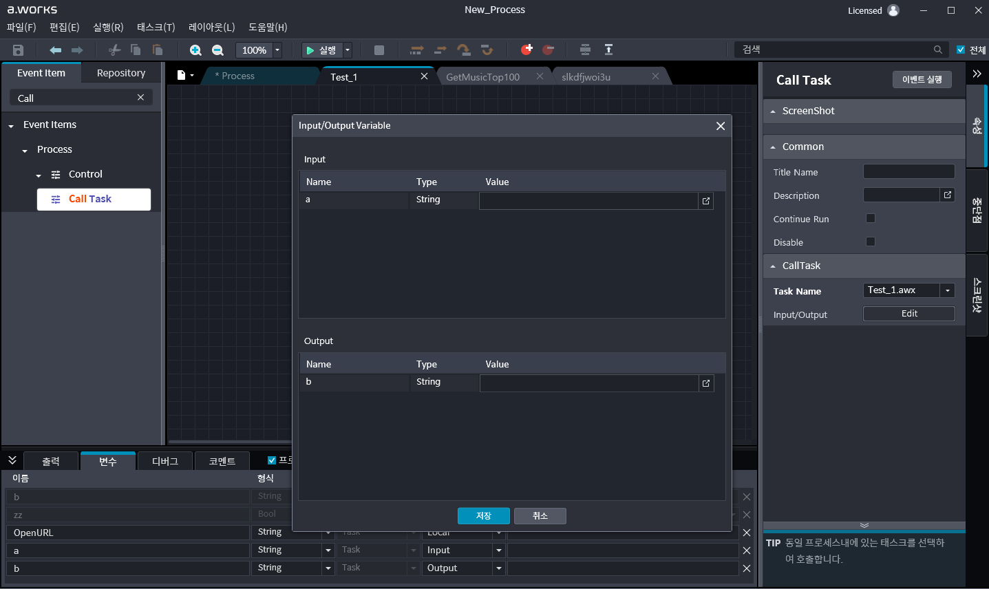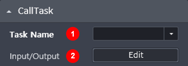 Task Canvas에서 Event Item을 검색하여 “Call Task”를 선택하여 스크립트로 선언하고 클릭 시 속성 탭이 활성화 됩니다.