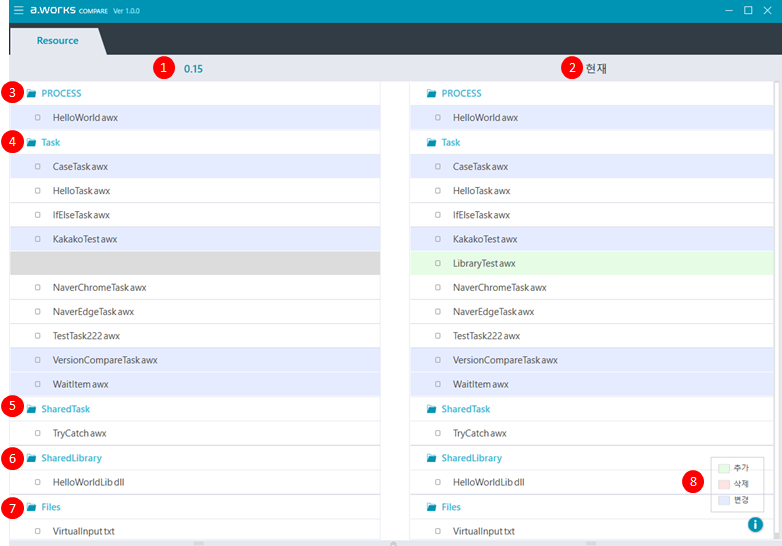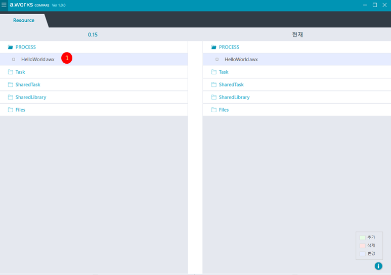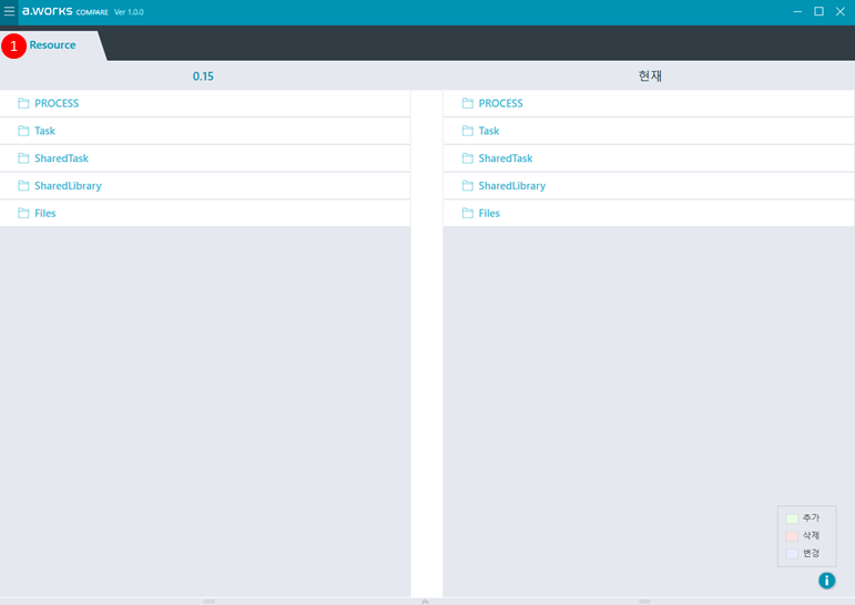 “확인” 버튼을 클릭하면 버전 비교(Compare) 프로그램이 실행됩니다. “Compare” 프로그램이 실행되면 “Resource” 탭이 표시됩니다. “Resource”는 PROCESS, Task, SharedFiles, SharedLibrary, Files 항목으로 구성됩니다.