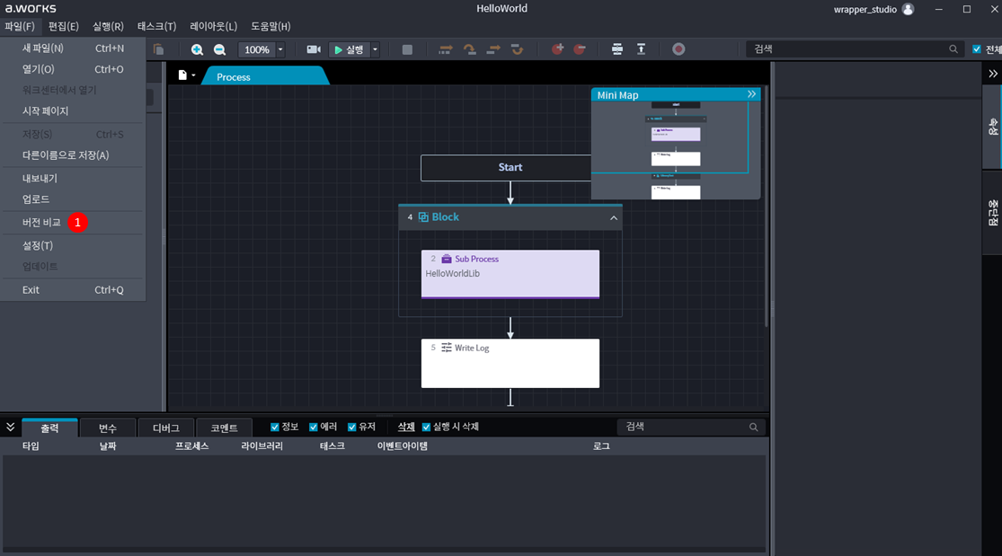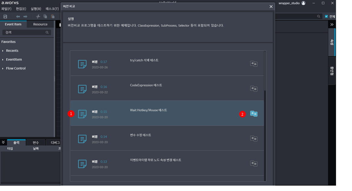 Studio 에서 스크립트 작성 시, 이전 버전과의 변경된 사항을 확인하기 위해서 “버전 비교” 기능을 사용합니다.