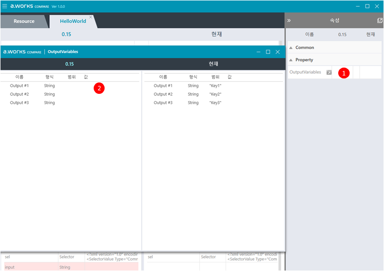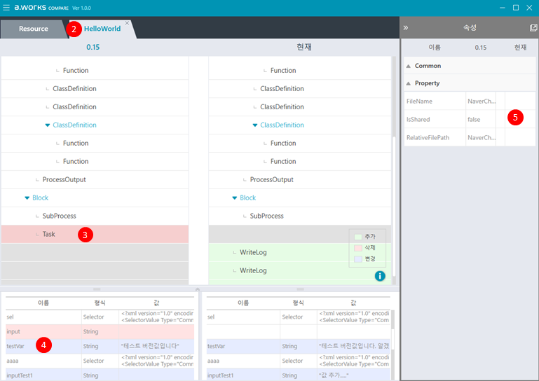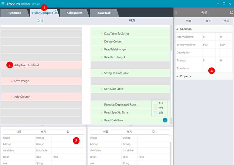 - 태스크 내 변수 항목에 대한 이전 버전과 현재버전간의 차이점을 표시합니다.