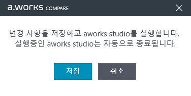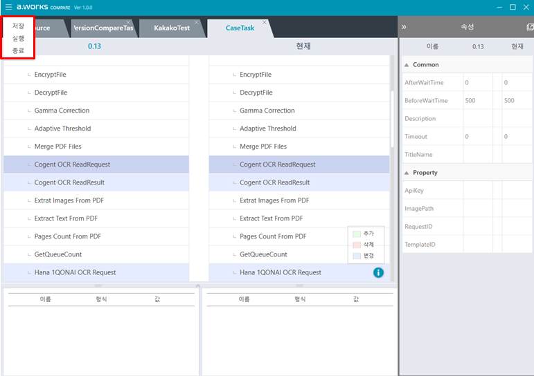 - “버전 비교” 작업 후, Merge 작업을 수행했을 경우 “저장”, “실행” 버튼을 통하여 변경사항 저장 및 내용을 확인할 수 있습니다.