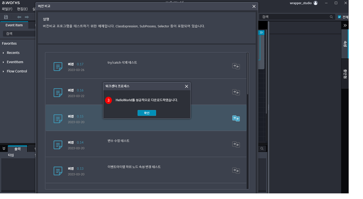 비교 버전을 선택하여 아이콘을 클릭하면, 선택한 버전 다운로드가 수행됩니다. “비교 버전” 다운로드가 완료되었을 경우, 다운로드 완료 메시지가 표시됩니다.