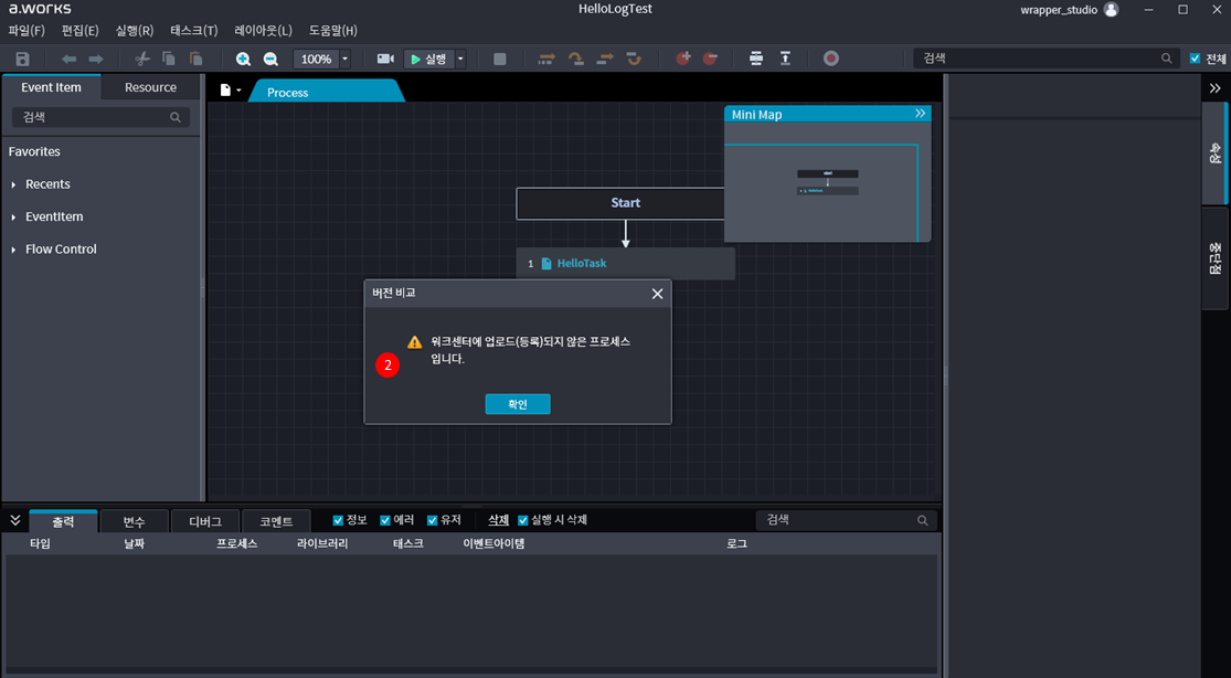 비교할 버전이 없는 프로세스에 대해서는 “워크센터에 업로드(등록)되지 않은 프로세스입니다” 메시지가 출력됩니다.
